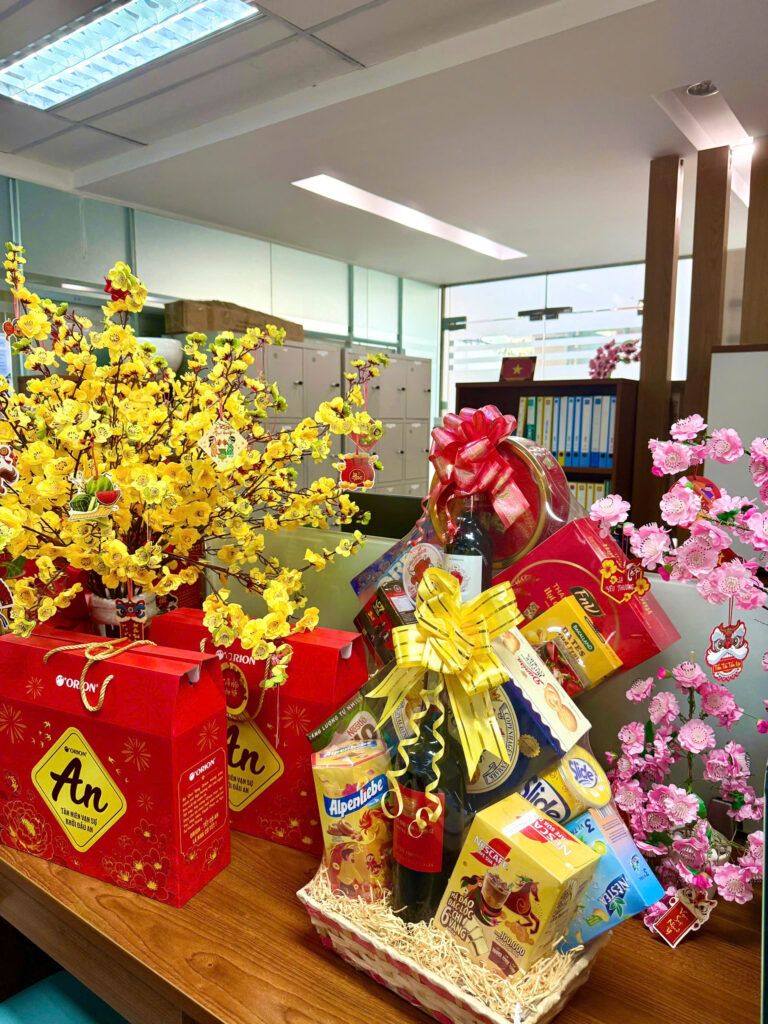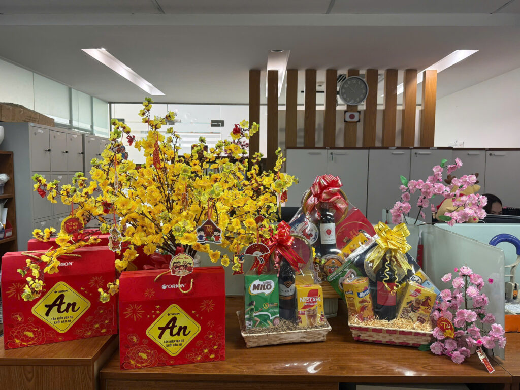 今年は、鮮やかな黄色の花を咲かせた梅の花を飾り、テトの贈り物を準備しました。社内は温かく、エネルギーに満ちた空間となっています。
